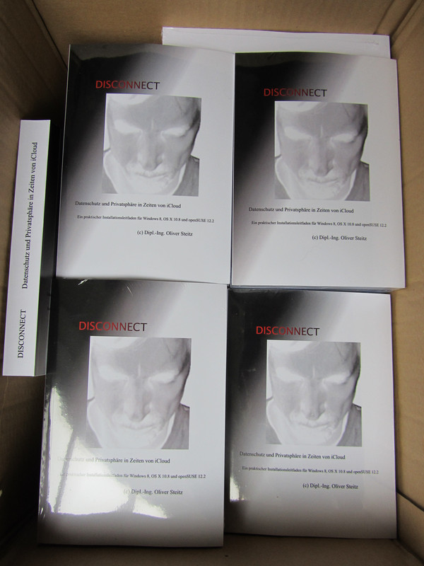 DISCONNECT (Softcover) Datenschutz und Privatsphäre in Zeiten von iCloud Ein praktischer Installationsleitfaden für Windows 8, OS X 10.8 und openSUSE 12.2 Oliver Steitz (Autor) ![]() Preis: 25 Euro kostenlose Lieferung innerhalb Deutschlands (inklusive Mehrwertsteuer) lieferbar (Ansicht) Veröffentlichung: 30. November 2012 Seitenzahl: 430 Sprache: Deutsch ISBN: 978-3-00-039997-8 Größe: DIN A5 Inhaltsverzeichnis: hier Bestellung: Lieferung des gedruckten Buches auf Anfrage über folgende E-Mail: info@steitzsoft.de Es werden nur Kunden innerhalb Deutschlands in max. 4 Wochen beliefert, eine Zahlung erfolgt per Rechnung. |